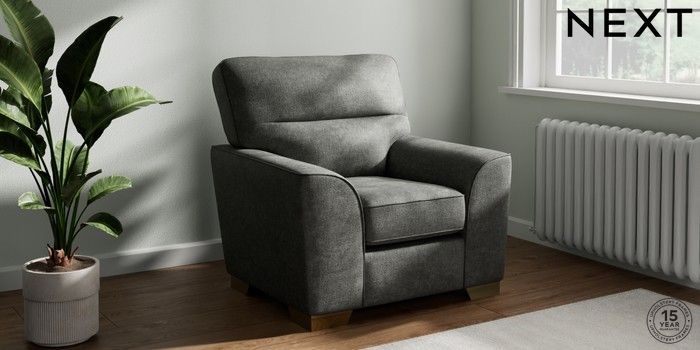 7.2.10 Buy Stamford Highback Armchair Plush Chenille Dark Grey Square Angle - Brushed Brass from the Next UK online shop Click here to use our accessible website