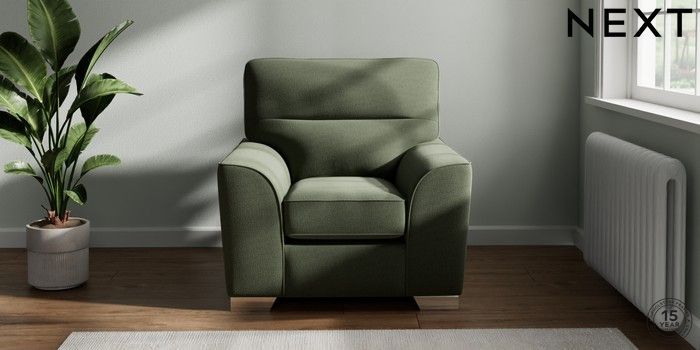 7.3.1 Buy Stamford Highback Armchair Relaxed Linen Look Dark Green Square Angle - Chrome Metal from the Next UK online shop Click here to use our accessible website