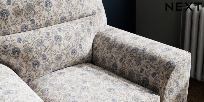 7.3.1 Buy Stamford Highback Armchair Relaxed Linen Look Print Woodblock Floral Blue Square Angle - Mid from the Next UK online shop Click here to use our accessible website