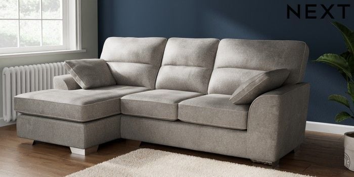 7.2.6 Buy Stamford Highback Medium Sofa Chaise - Left Hand Plush Chenille Light Grey Large Square Angle - Chrome Metal from the Next UK online shop Click here to use our accessible website
