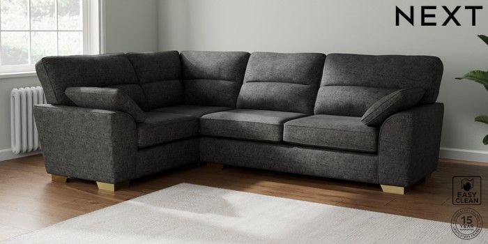 7.2.6 Buy Stamford Highback Large Corner Sofa - Left Hand Boucle Weave Easy Clean Charcoal Grey Large Square Angle - Brushed Brass from the Next UK online shop Click here to use our accessible website