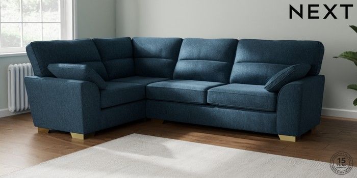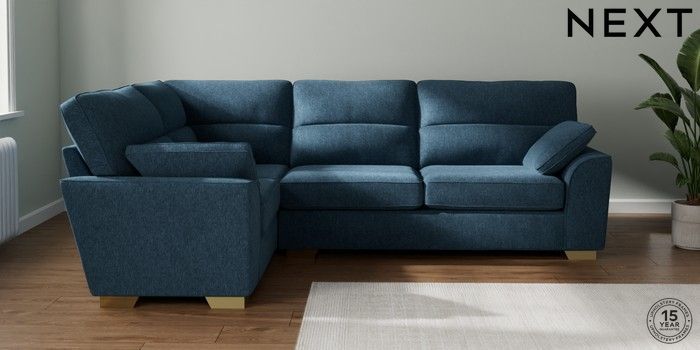 7.2.10 Buy Stamford Highback Large Corner Sofa - Left Hand Cotswold Chenille Dark Blue Large Square Angle - Brushed Brass from the Next UK online shop Click here to use our accessible website