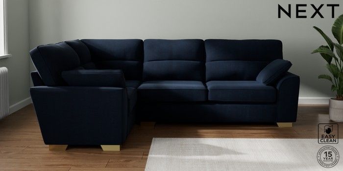 7.2.10 Buy Stamford Highback Large Corner Sofa - Left Hand Fine Chenille Easy Clean Dark Navy Blue Large Square Angle - Brushed Brass from the Next UK online shop Click here to use our accessible website