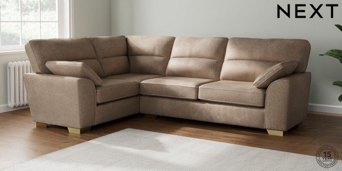 7.2.10 Buy Stamford Highback Large Corner Sofa - Left Hand Plush Chenille Mid Natural Large Square Angle - Brushed Brass from the Next UK online shop Click here to use our accessible website