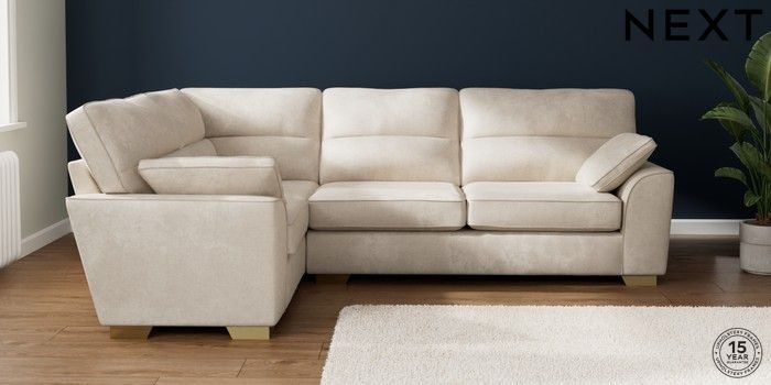 7.2.10 Buy Stamford Highback Large Corner Sofa - Left Hand Plush Chenille Oyster Large Square Angle - Brushed Brass from the Next UK online shop Click here to use our accessible website