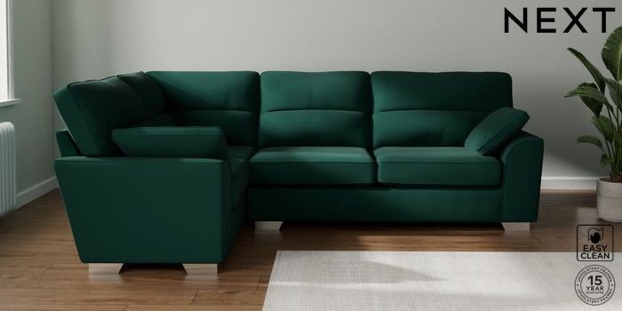 7.3.1 Buy Stamford Highback Large Corner Sofa - Left Hand Plush Velvet Easy Clean Bottle Green Large Square Angle - Chrome Metal from the Next UK online shop Click here to use our accessible website