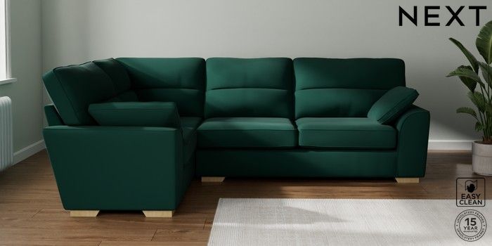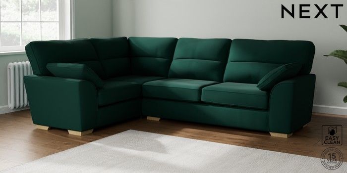 7.2.10 Buy Stamford Highback Large Corner Sofa - Left Hand Plush Velvet Easy Clean Bottle Green Large Square Angle - Light from the Next UK online shop Click here to use our accessible website