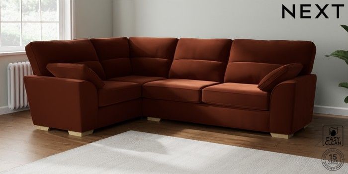 7.2.6 Buy Stamford Highback Large Corner Sofa - Left Hand Plush Velvet Easy Clean Ginger Orange Large Square Angle - Light from the Next UK online shop Click here to use our accessible website
