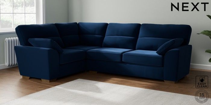 7.2.6 Buy Stamford Highback Large Corner Sofa - Left Hand Plush Velvet Easy Clean Navy Blue Large Square Angle - Mid from the Next UK online shop Click here to use our accessible website