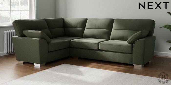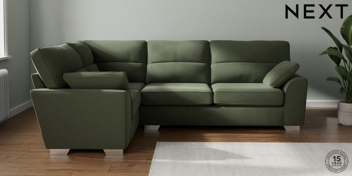 7.3.1 Buy Stamford Highback Large Corner Sofa - Left Hand Relaxed Linen Look Dark Green Large Square Angle - Chrome Metal from the Next UK online shop Click here to use our accessible website