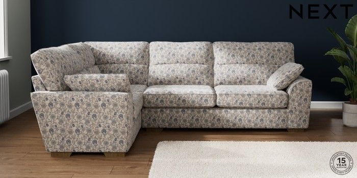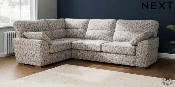 7.3.1 Buy Stamford Highback Large Corner Sofa - Left Hand Relaxed Linen Look Print Woodblock Floral Blue Large Square Angle - Mid from the Next UK online shop Click here to use our accessible website