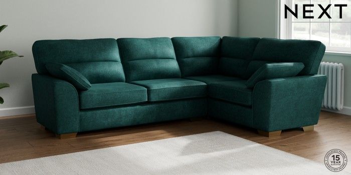 7.2.6 Buy Stamford Highback Large Corner Sofa - Right Hand Plush Chenille Dark Teal Green Large Square Angle - Brushed Brass from the Next UK online shop Click here to use our accessible website