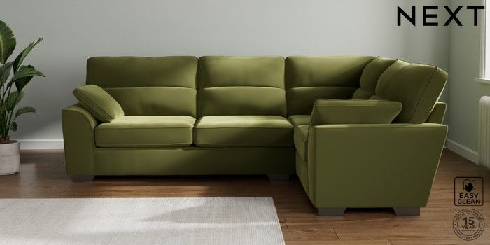 7.3.1 Buy Stamford Highback Large Corner Sofa - Right Hand Plush Velvet Easy Clean Mid Olive Green Large Square Angle - Gunmetal from the Next UK online shop Click here to use our accessible website