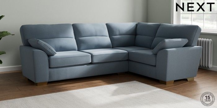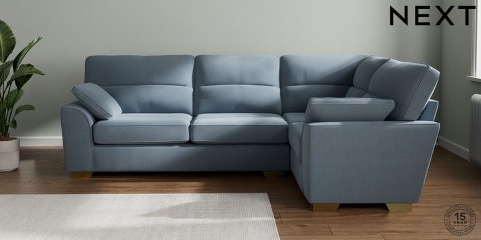 7.2.10 Buy Stamford Highback Large Corner Sofa - Right Hand Relaxed Linen Look Mid Blue Large Square Angle - Brushed Brass from the Next UK online shop Click here to use our accessible website