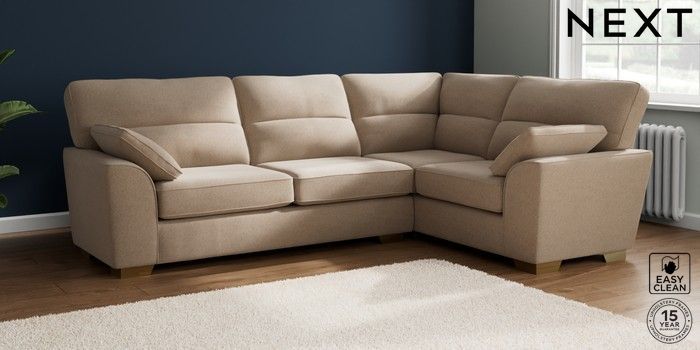 7.2.6 Buy Stamford Highback Large Corner Sofa - Right Hand Tweedy Blend Easy Clean Light Dove Natural Large Square Angle - Brushed Brass from the Next UK online shop Click here to use our accessible website