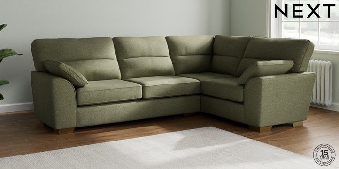 7.2.10 Buy Stamford Highback Large Corner Sofa - Right Hand Tweedy Chenille Mid Moss Green Large Square Angle - Brushed Brass from the Next UK online shop Click here to use our accessible website