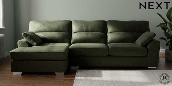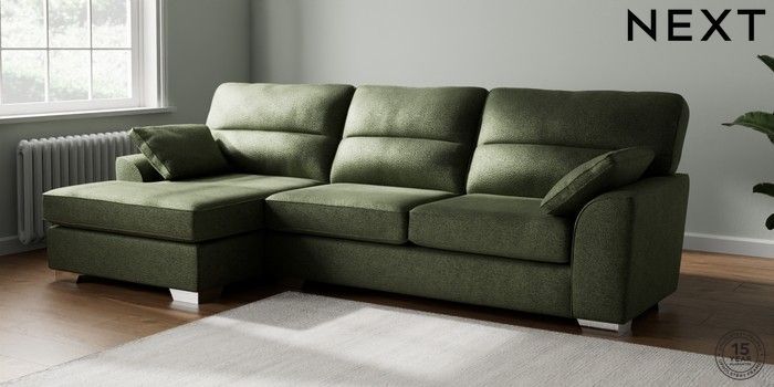 7.3.1 Buy Stamford Highback Large Sofa Chaise - Left Hand Boucle Chenille Dark Moss Green Large Square Angle - Chrome Metal from the Next UK online shop Click here to use our accessible website