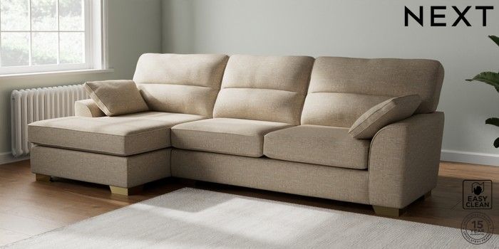 7.2.10 Buy Stamford Highback Large Sofa Chaise - Left Hand Boucle Weave Easy Clean Dark Natural Large Square Angle - Brushed Brass from the Next UK online shop Click here to use our accessible website