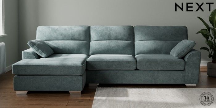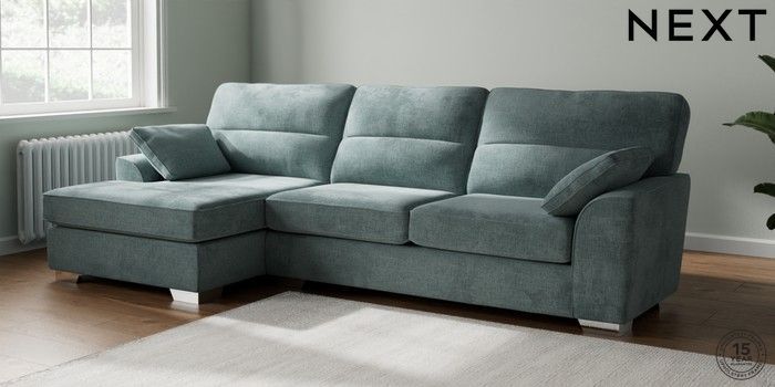 7.2.10 Buy Stamford Highback Large Sofa Chaise - Left Hand Chunky Chenille Light Teal Green Large Square Angle - Chrome Metal from the Next UK online shop Click here to use our accessible website