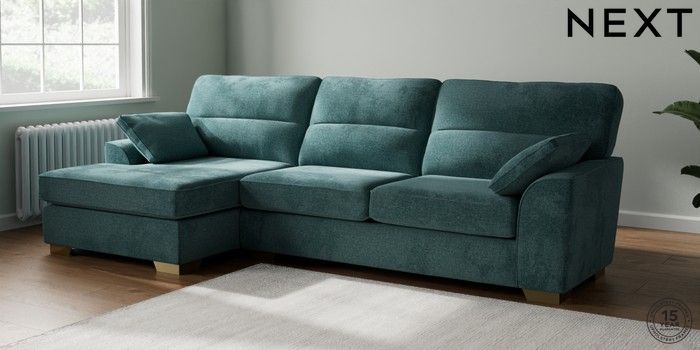 7.2.10 Buy Stamford Highback Large Sofa Chaise - Left Hand Chunky Chenille Mid Teal Green Large Square Angle - Brushed Brass from the Next UK online shop Click here to use our accessible website