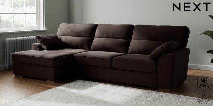 7.2.10 Buy Stamford Highback Large Sofa Chaise - Left Hand Fine Chenille Easy Clean Chocolate Brown Large Square Angle - Mid from the Next UK online shop Click here to use our accessible website