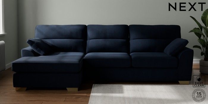 7.2.10 Buy Stamford Highback Large Sofa Chaise - Left Hand Fine Chenille Easy Clean Dark Navy Blue Large Square Angle - Brushed Brass from the Next UK online shop Click here to use our accessible website