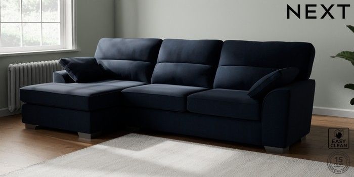 7.3.1 Buy Stamford Highback Large Sofa Chaise - Left Hand Fine Chenille Easy Clean Dark Navy Blue Large Square Angle - Gunmetal from the Next UK online shop Click here to use our accessible website