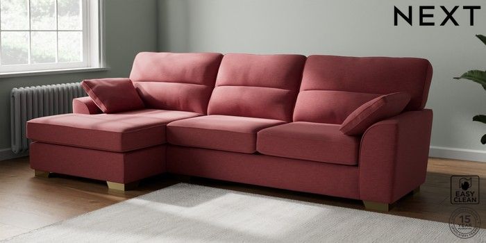 7.2.10 Buy Stamford Highback Large Sofa Chaise - Left Hand Fine Chenille Easy Clean Mid Pink Large Square Angle - Brushed Brass from the Next UK online shop Click here to use our accessible website