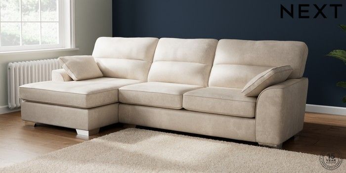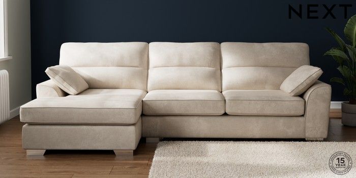7.2.10 Buy Stamford Highback Large Sofa Chaise - Left Hand Plush Chenille Oyster Large Square Angle - Chrome Metal from the Next UK online shop Click here to use our accessible website