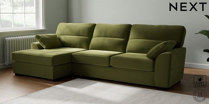 7.3.1 Buy Stamford Highback Large Sofa Chaise - Left Hand Plush Velvet Easy Clean Mid Olive Green Large Square Angle - Dark from the Next UK online shop Click here to use our accessible website