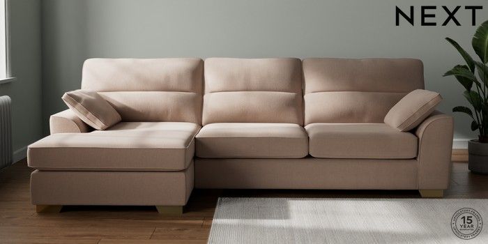 7.3.1 Buy Stamford Highback Large Sofa Chaise - Left Hand Relaxed Linen Look Mid Natural Large Square Angle - Brushed Brass from the Next UK online shop Click here to use our accessible website