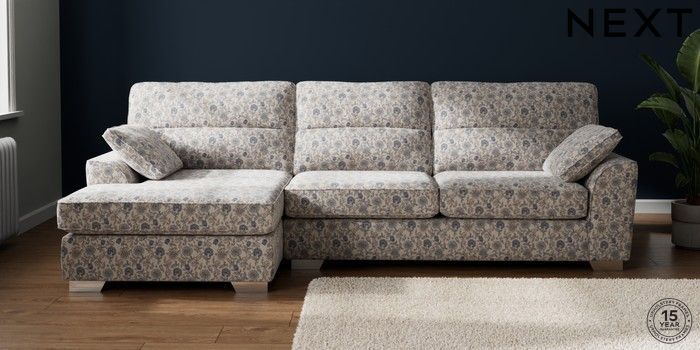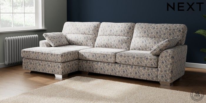 7.3.1 Buy Stamford Highback Large Sofa Chaise - Left Hand Relaxed Linen Look Print Woodblock Floral Blue Large Square Angle - Chrome Metal from the Next UK online shop Click here to use our accessible website