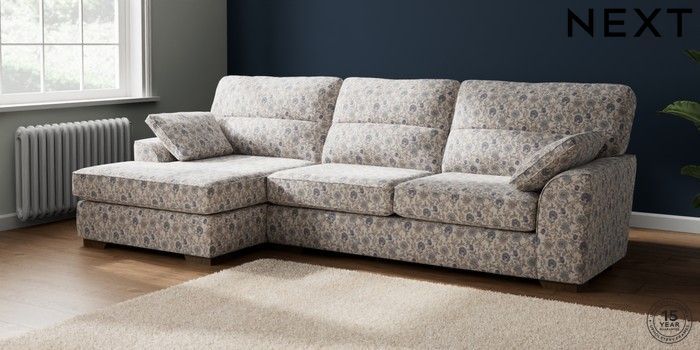 7.3.1 Buy Stamford Highback Large Sofa Chaise - Left Hand Relaxed Linen Look Print Woodblock Floral Blue Large Square Angle - Mid from the Next UK online shop Click here to use our accessible website