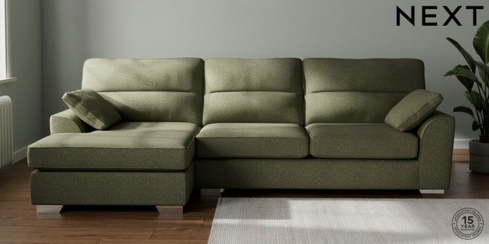 7.3.1 Buy Stamford Highback Large Sofa Chaise - Left Hand Tweedy Chenille Mid Moss Green Large Square Angle - Chrome Metal from the Next UK online shop Click here to use our accessible website