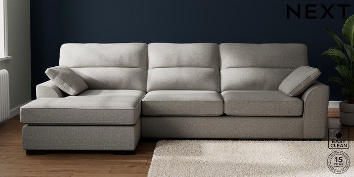 7.2.10 Buy Stamford Highback Large Sofa Chaise - Left Hand Woven Chenille Easy Clean Light Grey Large Square Angle - Dark from the Next UK online shop Click here to use our accessible website
