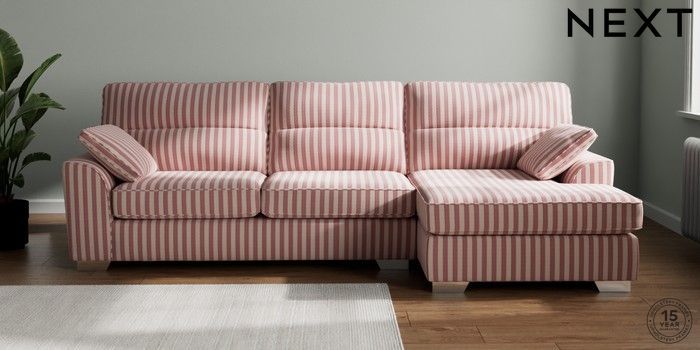 7.3.1 Buy Stamford Highback Large Sofa Chaise - Right Hand Bold Chenille Stripe Dark Pink Large Square Angle - Chrome Metal from the Next UK online shop Click here to use our accessible website