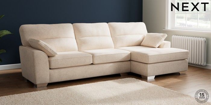 7.2.10 Buy Stamford Highback Large Sofa Chaise - Right Hand Boucle Chenille Oyster Large Square Angle - Chrome Metal from the Next UK online shop Click here to use our accessible website