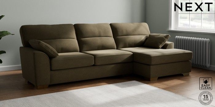 7.3.1 Buy Stamford Highback Large Sofa Chaise - Right Hand Fine Chenille Easy Clean Dark Moss Green Large Square Angle - Brushed Brass from the Next UK online shop Click here to use our accessible website