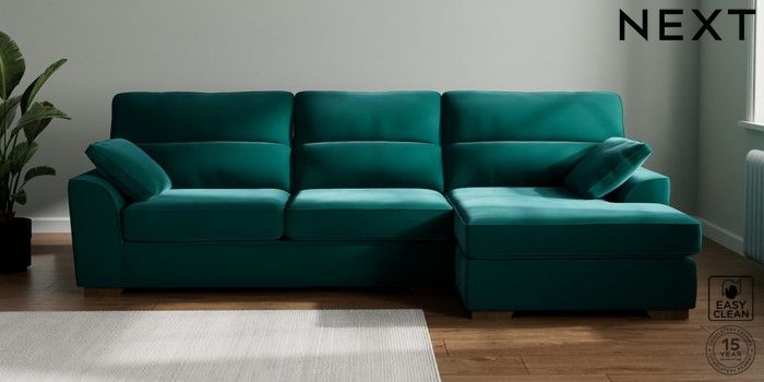 7.2.10 Buy Stamford Highback Large Sofa Chaise - Right Hand Plush Velvet Easy Clean Juniper Green Large Square Angle - Mid from the Next UK online shop Click here to use our accessible website