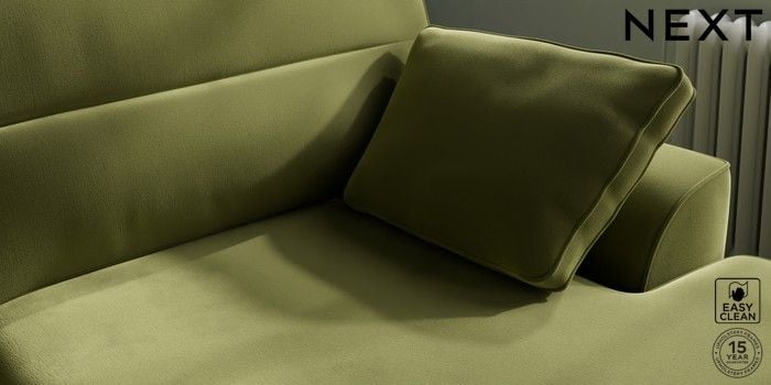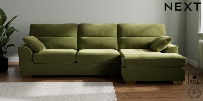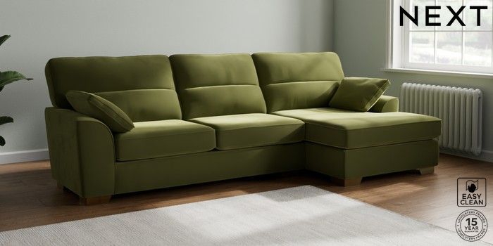 7.3.1 Buy Stamford Highback Large Sofa Chaise - Right Hand Plush Velvet Easy Clean Mid Olive Green Large Square Angle - Brushed Brass from the Next UK online shop Click here to use our accessible website