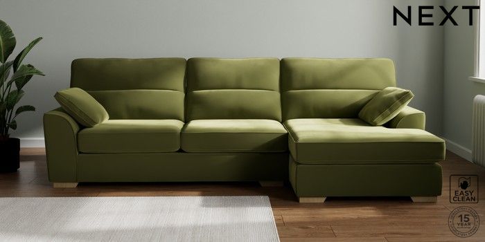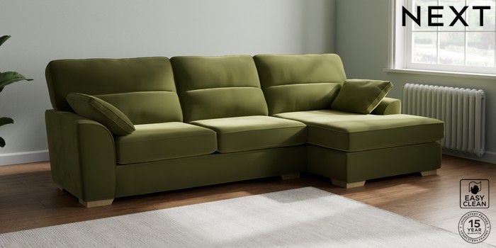 7.3.1 Buy Stamford Highback Large Sofa Chaise - Right Hand Plush Velvet Easy Clean Mid Olive Green Large Square Angle - Light from the Next UK online shop Click here to use our accessible website