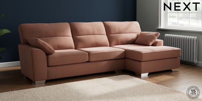7.2.10 Buy Stamford Highback Large Sofa Chaise - Right Hand Relaxed Linen Look Light Rust Brown Large Square Angle - Chrome Metal from the Next UK online shop Click here to use our accessible website