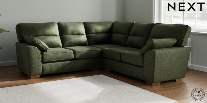 7.2.6 Buy Stamford Highback Medium Corner Sofa - Universal Boucle Chenille Dark Moss Green Large Square Angle - Brushed Brass from the Next UK online shop Click here to use our accessible website