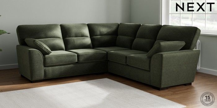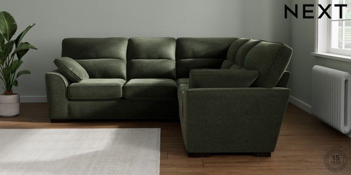 7.2.6 Buy Stamford Highback Medium Corner Sofa - Universal Luxe Chenille Mid Green Large Square Angle - Dark from the Next UK online shop Click here to use our accessible website