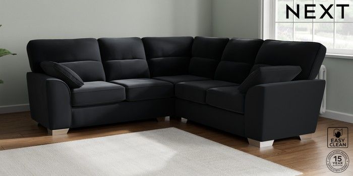 7.3.1 Buy Stamford Highback Medium Corner Sofa - Universal Plush Velvet Easy Clean Charcoal Grey Large Square Angle - Chrome Metal from the Next UK online shop Click here to use our accessible website