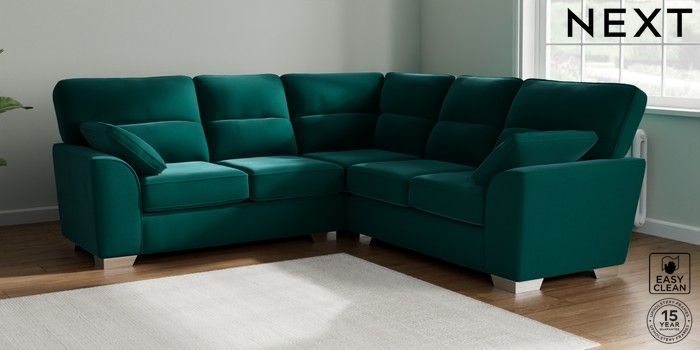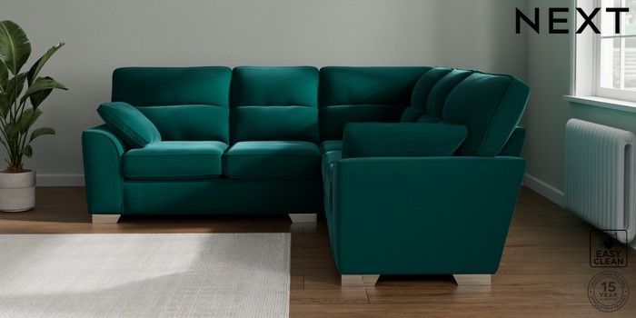 7.3.1 Buy Stamford Highback Medium Corner Sofa - Universal Plush Velvet Easy Clean Juniper Green Large Square Angle - Chrome Metal from the Next UK online shop Click here to use our accessible website