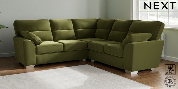 7.2.6 Buy Stamford Highback Medium Corner Sofa - Universal Plush Velvet Easy Clean Mid Olive Green Large Square Angle - Chrome Metal from the Next UK online shop Click here to use our accessible website