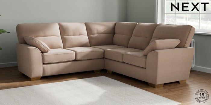 7.2.10 Buy Stamford Highback Medium Corner Sofa - Universal Relaxed Linen Look Mid Natural Large Square Angle - Brushed Brass from the Next UK online shop Click here to use our accessible website