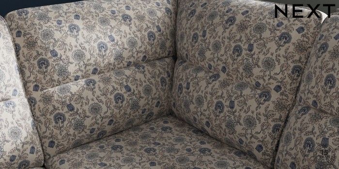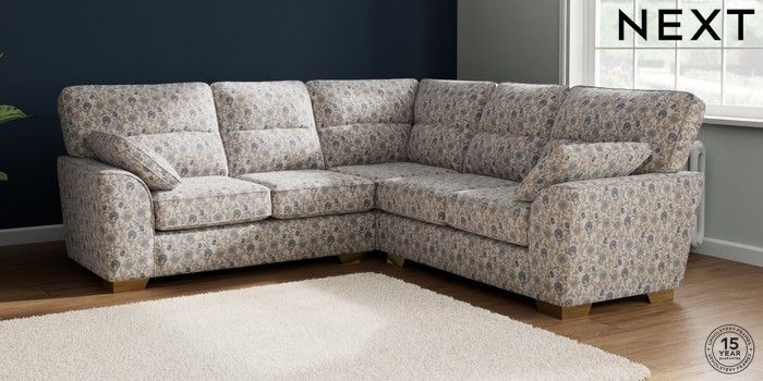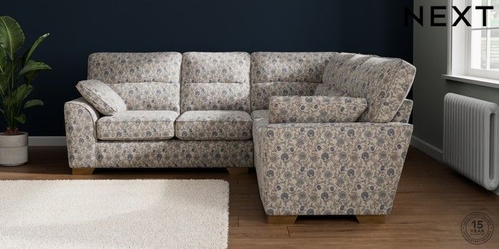 7.3.1 Buy Stamford Highback Medium Corner Sofa - Universal Relaxed Linen Look Print Woodblock Floral Blue Large Square Angle - Brushed Brass from the Next UK online shop Click here to use our accessible website