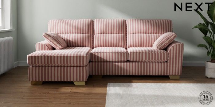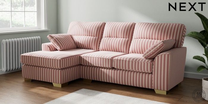 7.3.1 Buy Stamford Highback Medium Sofa Chaise - Left Hand Bold Chenille Stripe Dark Pink Large Square Angle - Brushed Brass from the Next UK online shop Click here to use our accessible website